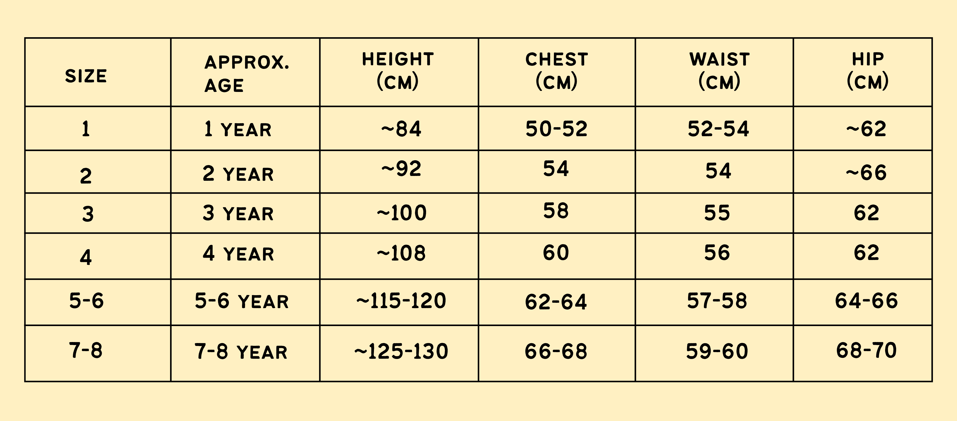 This size guide is basd on Australian Children's sizing standards. Our Lokal Folk pieces are generous sizing to ensure they last the distance with your child. Please ensure to size down if your child is smaller for their age.